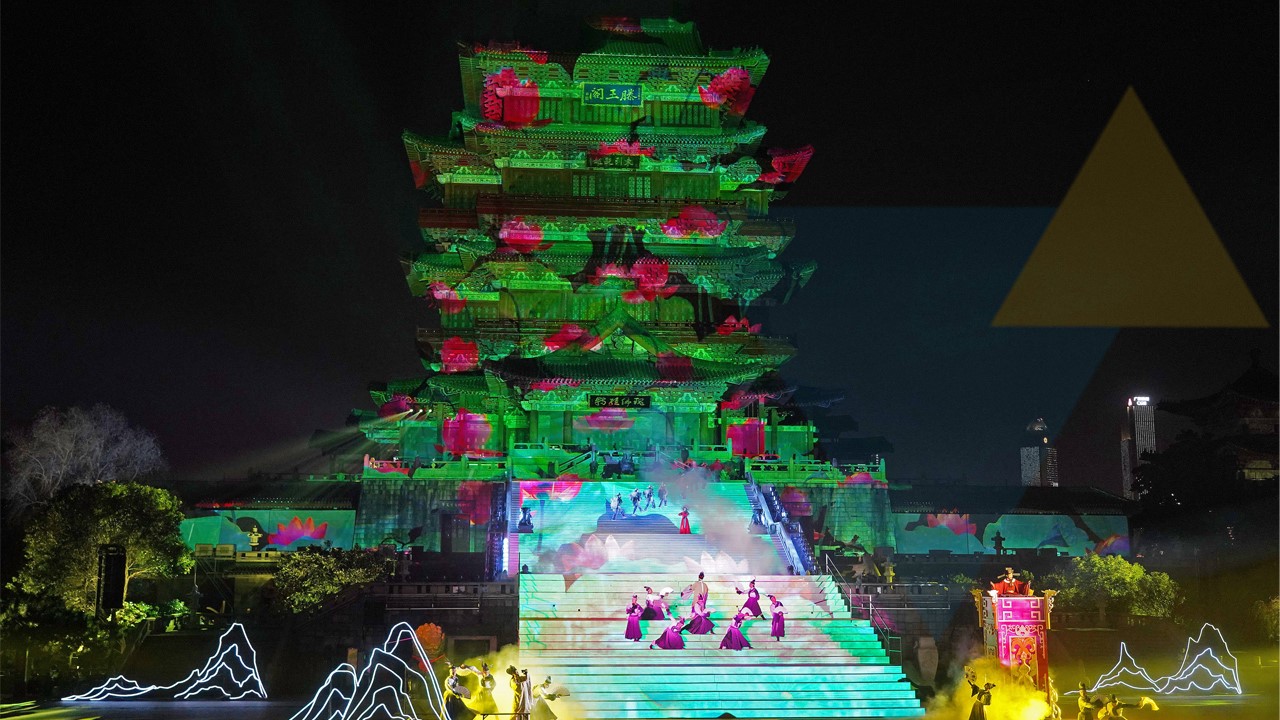 《寻梦滕王阁》实景演出,由南昌市和阳光传媒集团杨澜小姐团队联袂打造,采用国际演艺界最前端的制作理念,配合全息数字影像技术、大型装置投影等声、光、电艺术手法,营造出一个如梦如幻、充满艺术感和想象力的独立空间
